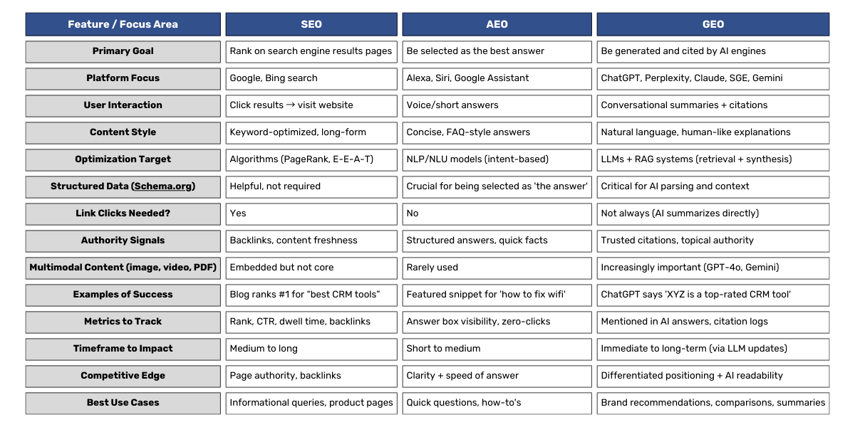 SEO remains effective for long-tail searches, evergreen content, and generating web traffic through informational queries. However, as digital behavior evolves—especially with users increasingly bypassing traditional search engines in favor of AI tools—SEO alone is no longer enough. This shift gave rise to a more answer-focused model: Answer Engine Optimization (AEO) and then Generative Engine Optimization (GEO).
